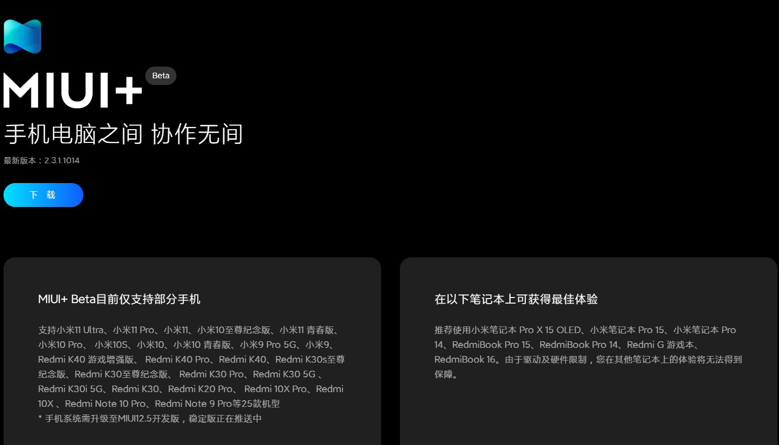 miui+只能用小米笔记本,支持的笔记本有小米笔记本 Pro X 15 OLED、小米笔记本 Pro 15、小米笔记本 Pro 14、RedmiBook Pro 15、RedmiBook Pro 14、Redmi G 游戏本、RedmiBook 16。