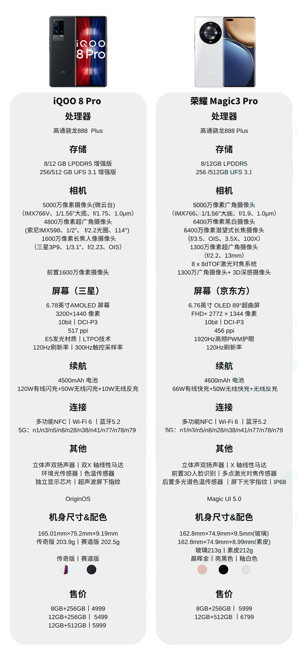 对比总结:对游戏体验有要求,喜欢更高素质的屏幕,对120W快充有要求,选择iQOO8 Pro。对拍照的要求更高一点选择Magic3 Pro。