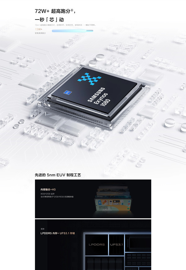 vivox70pro搭载三星E1080+LPDDR5 +UFS3.1的性能组合,采用5nm制程工艺,CPU主频为2.8GHz*1+2.6GHz*3+2.0GHz*4,GPU(图形处理器)型号为ARM G78。