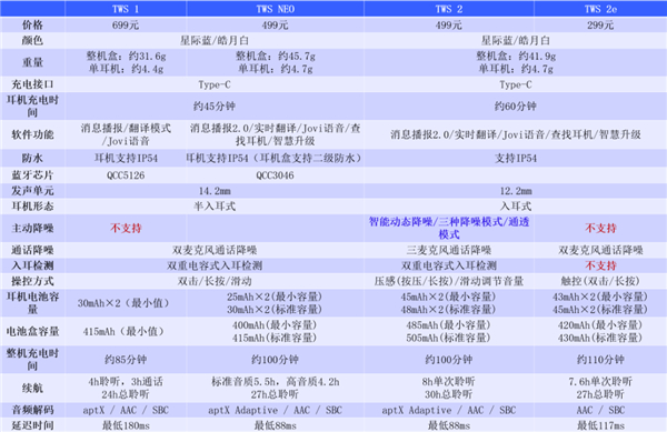 vivo TWS 2和vivo TWS 2e两款采用相同外观设计,都提供星级蓝和皓月白配色,耳柄不算太长,属于入耳式方案,单耳重4.7克,都支持多设备双链接,支持蓝牙5.2,可以语音操控,收纳充电盒采用USB-C接口,耳机充满电需要60分钟,收纳充电盒需要110分钟。