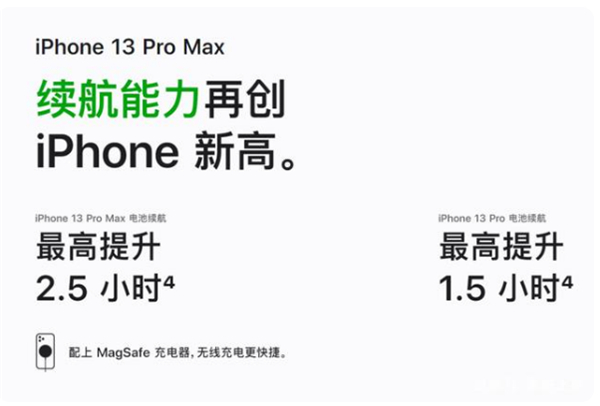 iPhone13系列相较于前代全面升级了电池容量,在续航方面也有所提升。像往年一样,苹果官方并未公布各机型的具体电池容量,而是用时间来量化代表。iPhone13ProMax是有史以来续航最为持久的iPhone机型,根据官方表述,超大杯可以视频播放最长28h,流媒体视频播放25h,音频播放95h;而在12ProMax上,这三个时长分比为20h、12h以及80h。或者换种表述方式,iPhone13ProMax的电池续航最高提升了2.5小时。