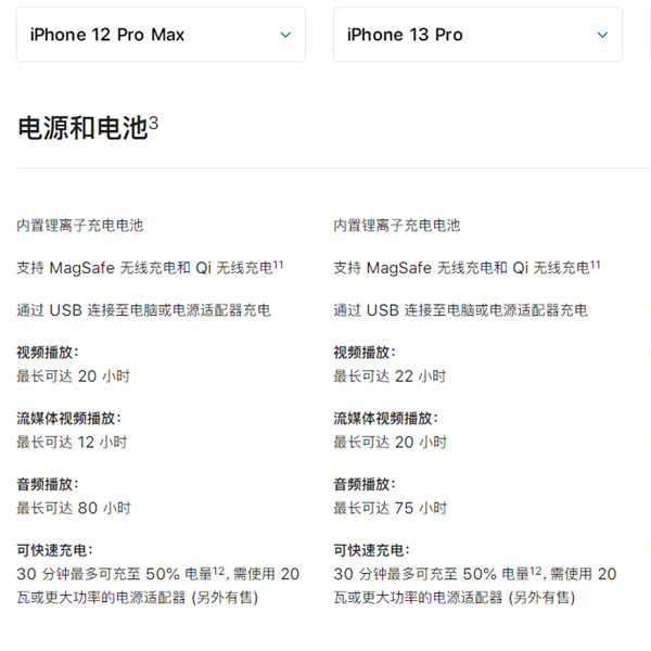iPhone13系列相较于前代全面升级了电池容量,在续航方面也有所提升。像往年一样,苹果官方并未公布各机型的具体电池容量,而是用时间来量化代表。苹果13pro视频播放最长可达22小时,流媒体视频播放最长可达20小时,音频播放最长可达75小时。而在12ProMax上,这三个时长分比为20h、12h以及80h。