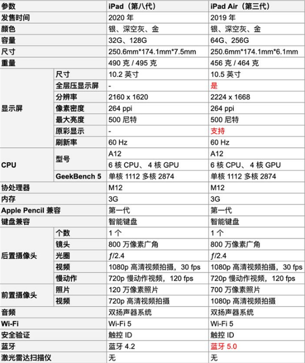 前置摄像头方面:iPad 2020是120万,ipad air 3是700万。
