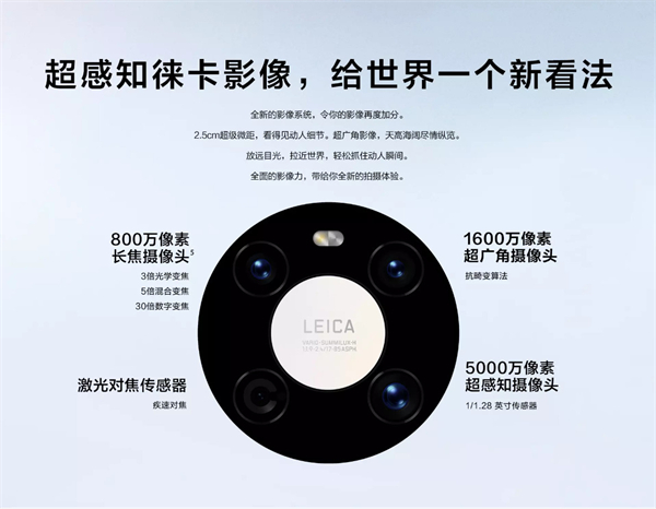 华为mate40后置支持5000万像素超感知摄像头(广角, f/1.9光圈 )+ 1600万像素超广角摄像头(超广角,f/2.2光圈)+ 800万像素长焦摄像头(f/2.4光圈,支持OIS光学防抖),支持自动对焦,前置支持1300万像素超感知摄像头(广角,f/2.4光圈)。