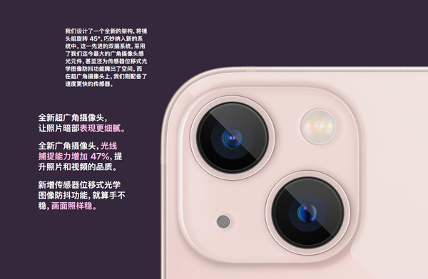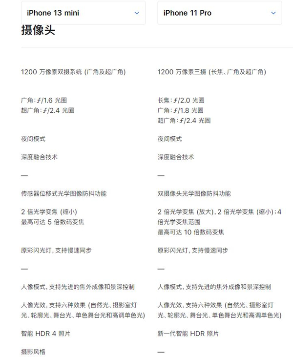 苹果13mini:后置1200万像素双摄系统(广角及超广角),拥有传感器位移式光学图像防抖功能,2 倍光学变焦 (缩小),最高可达 5 倍数码变焦。前置1200 万像素照片原深感摄像头。支持摄影风格、电影效果模式、夜间模式延时摄影、杜比视界 HDR 视频拍摄等等功能。