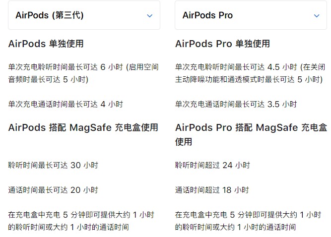 3、续航方面:AirPods3单次充电聆听时间最长可达 6 小时,搭配 MagSafe 充电盒使用,聆听时间最长可达 30 小时。Airpods Pro单次充电聆听时间最长可达 4.5 小时,搭配 MagSafe 充电盒使用,聆听时间最长可达 24 小时。