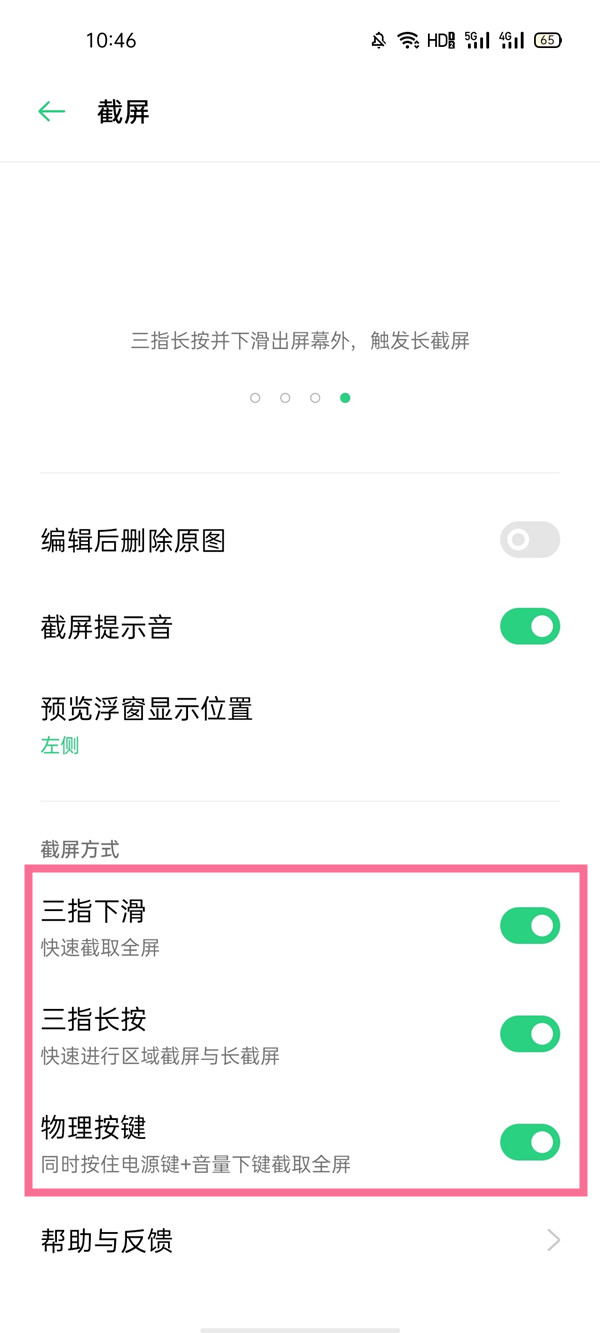 3、打开【三指下滑】、【三指长按】、【物理按键】的开关。