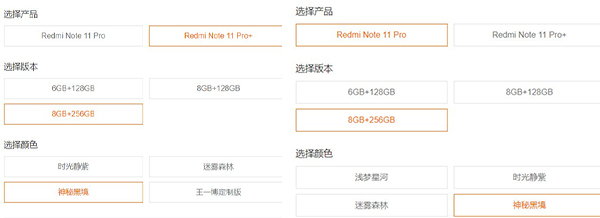 红米note11pro有神秘黑境,时光静紫,浅梦星河,迷雾森林四款配色,重量是207g,支持5160mAh电池+67W 闪充,11pro+有神秘黑境,时光静紫,迷雾森林三款配色和王一博定制版,重量是204g,支持4500mAh电池+120W秒充。