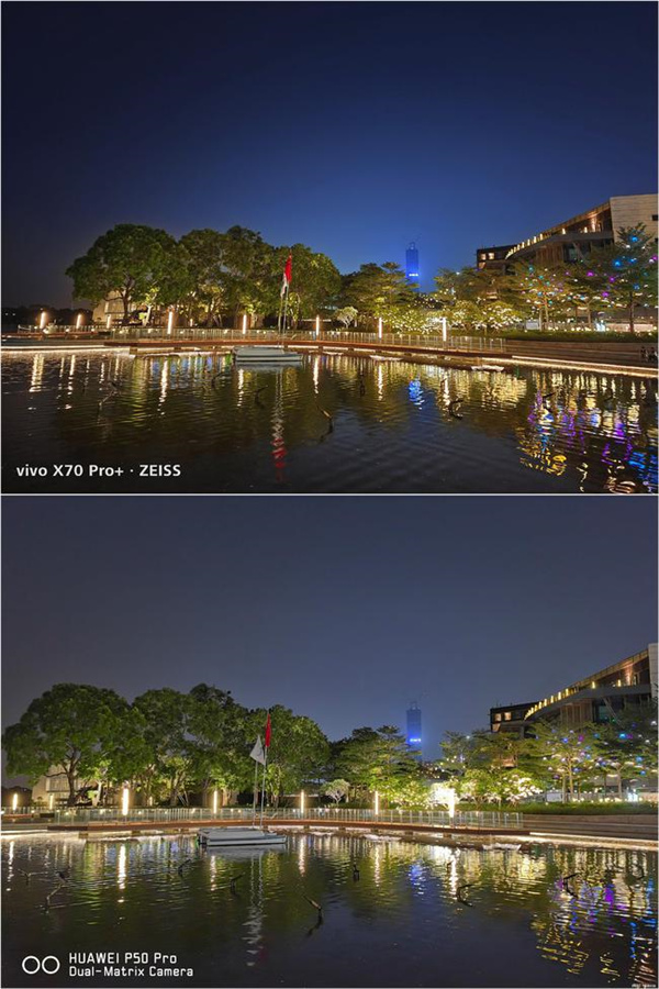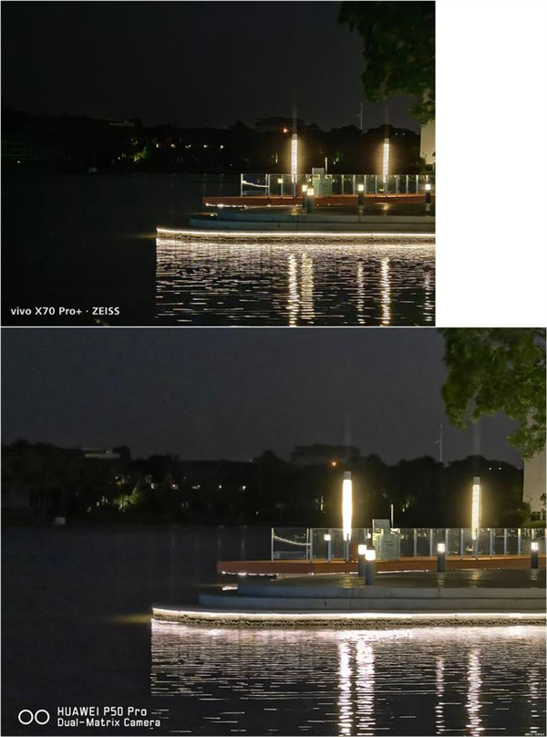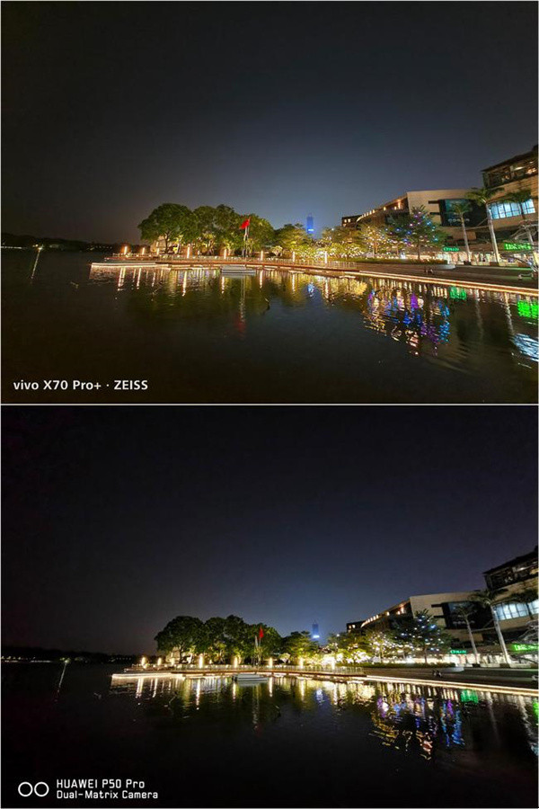 两者的主摄夜拍效果,单独来看算是不错,但摆在一起对比,就能轻易地挑出不足。比如说vivo X70 Pro+的天空偏蓝,华为P50 Pro仍旧存在高光处理不好的问题。