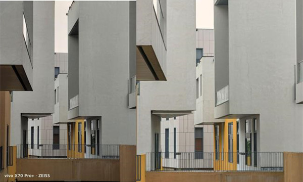 将样张局部放大进行对比的话,我们可以看到华为P50 Pro的照片成像涂抹感会更重,栏杆、楼房的细节几乎没有。而vivo X70 Pro+的超广角镜头拥有4800万像素,加上还具备微云台防抖技术,因此能够保留更多的画面细节。