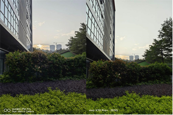 局部放大照片对比细节的话,可以看到vivo X70 Pro+的成像会更锐利一些,树叶基本上都是一片一片的,处于可辨认的状态,而华为P50 Pro的树叶已经糊成了一团,无法分辨出来,加上高光压制不好,放大看的话,观感会差一些。