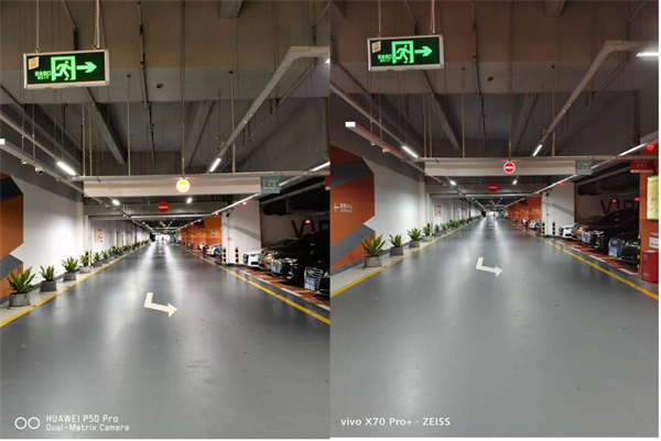 接下来是夜景模式。由于光线比较复杂,因此这一场景更能证明一款产品的镜头素质与影像算法。在下面这组车库样张中,就显示出了二者的差异。比如上面的红色禁行标志,在 vivo X70 Pro+ 的照片中依然是鲜艳的红色,而在华为 P50 Pro 的镜头下则变成了橙色。而且在车库的尽头,场景的清晰度上华为 P50 Pro 也不如 vivo X70 Pro+ 那么细致。