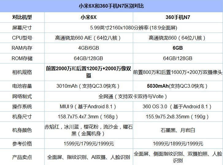 小米6X提供4+64GB、6+64GB、6+128GB三个版本,售价分别是1599元、1799元和1999元。360手机N7则提供6+64GB、6+128GB两个版本,相当于砍掉了4+64GB版本,售价分别是1699元和1899元。
