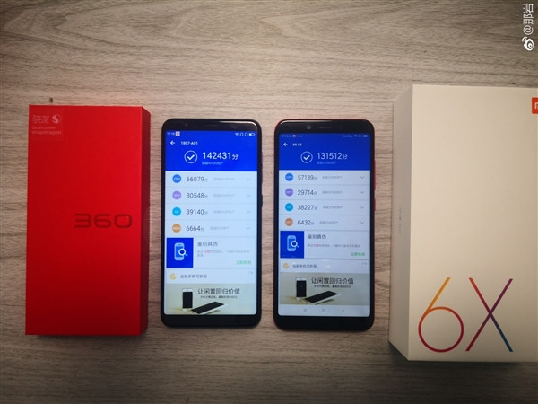 如上图所示,360 N7安兔兔跑分成绩为142431分,小米6X安兔兔跑分成绩为131512分,水准属于一个档次,差距还是非常小的。