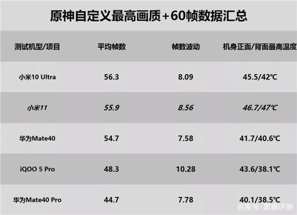 小米11的平均帧数是48.3,机身正面发热41.2度,帧率波动为13.51。华为Mate40的平均帧数是52.9,正面发热40.9度,帧数波动12.25。