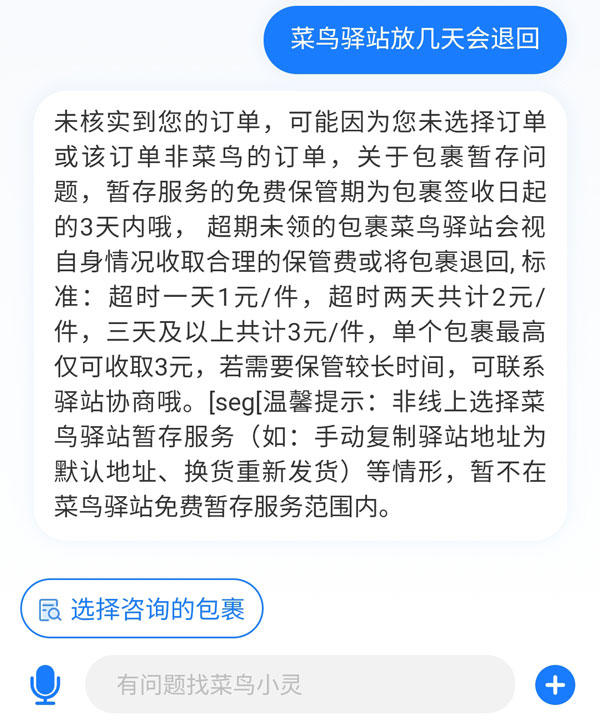 温馨提示:非线上选择菜鸟驿站暂存服务(如:手动复制驿站地址为默认地址、换货重新发货)等情形,暂不在菜鸟驿站免费暂存服务范围内。