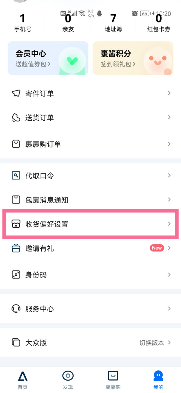 1、打开手机菜鸟,在“我的”页面点击【收货偏好设置】。