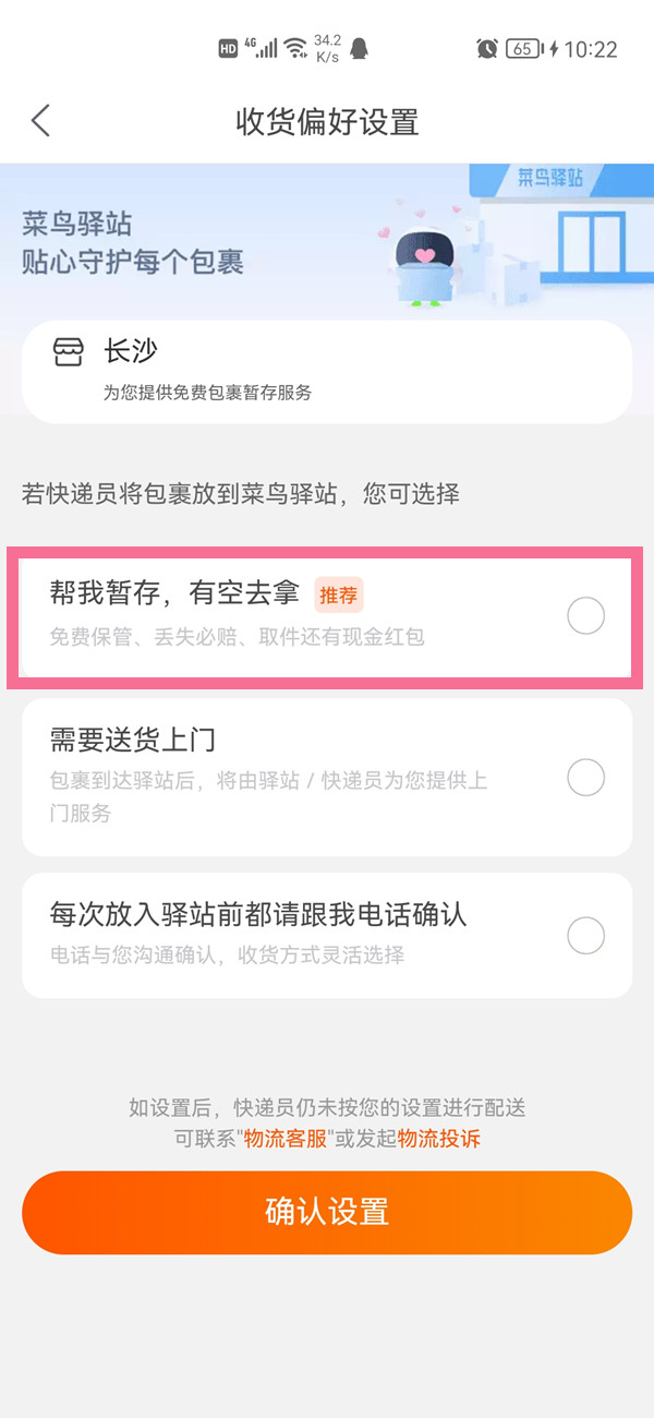2、选择要设置的菜鸟驿站,取消暂存后点击【确认设置】即可。