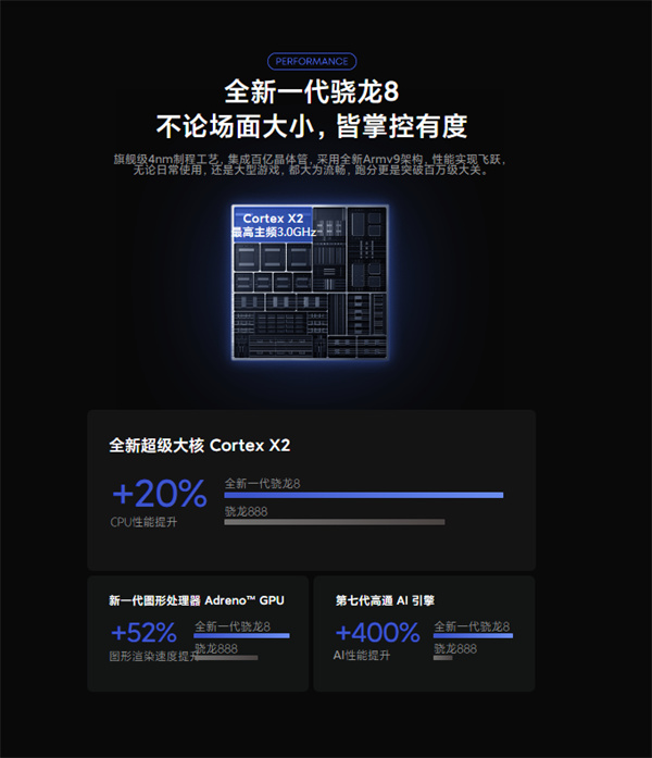 两款手机都搭载全新一代骁龙8处理器,配备LPDDR5 6400Mbps+满血新一代UFS 3.1闪存,之所以称之为满血是写入速度有了大幅提升,提供均衡/性能/极致三种模式。