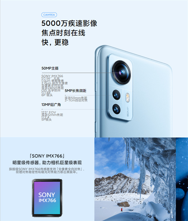 小米12后置为5000万像素IMX766主摄,支持全像素全向对焦、OIS光学防抖,以及长焦微距+1300万像素超广角镜头。