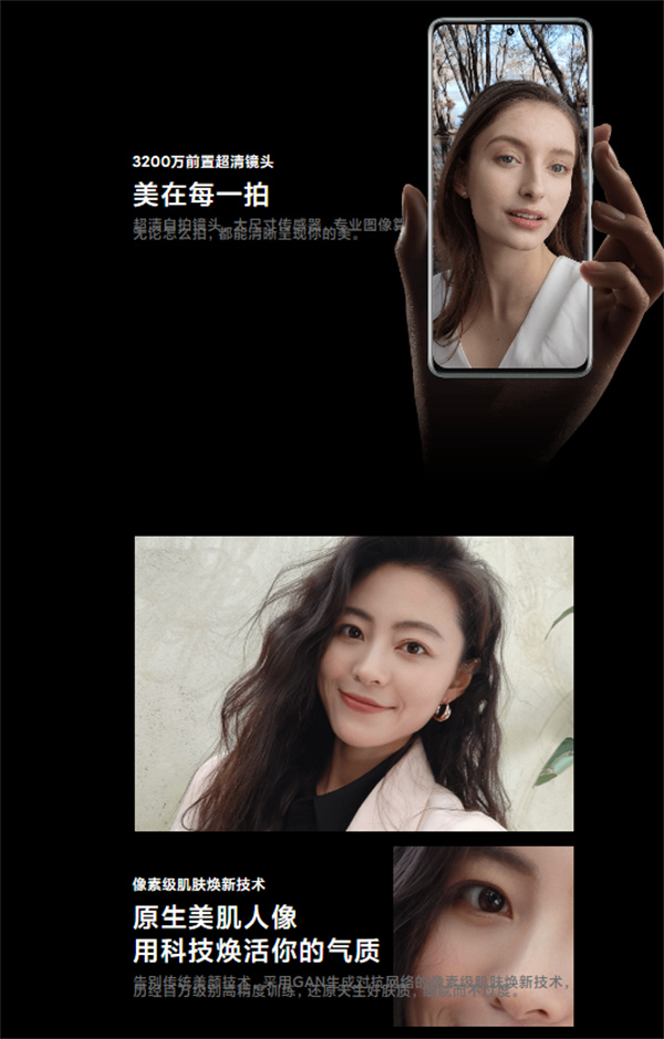 而且前置3200万像素自拍镜头,支持硬件级Stagger HDR和夜景模式补光环,以及原生美肌人像等。