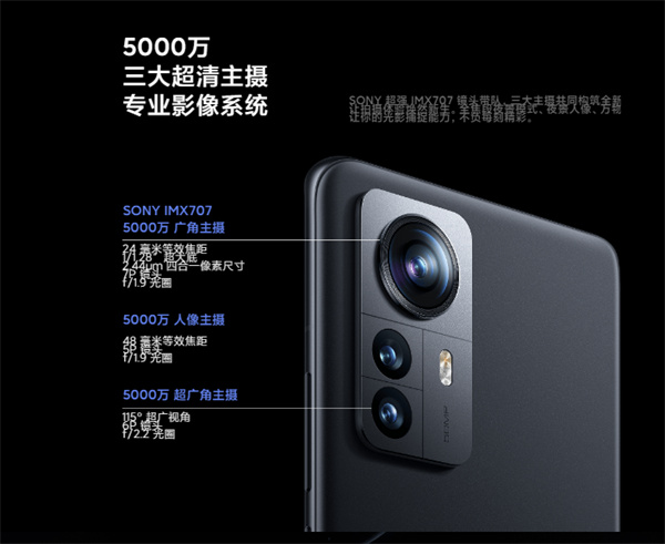 小米12 Pro后置为5000万像素广角+5000万像素人像+5000万像素超广角三摄,其中主摄首发IMX707 CMOS,1/1.28大底,支持OIS光学防抖。