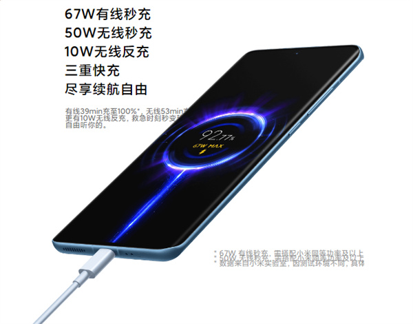 小米12电池容量为4500mAh,支持67W有线快充,官方数据39分钟充满,以及50W无线秒充和10W无线反向充电。