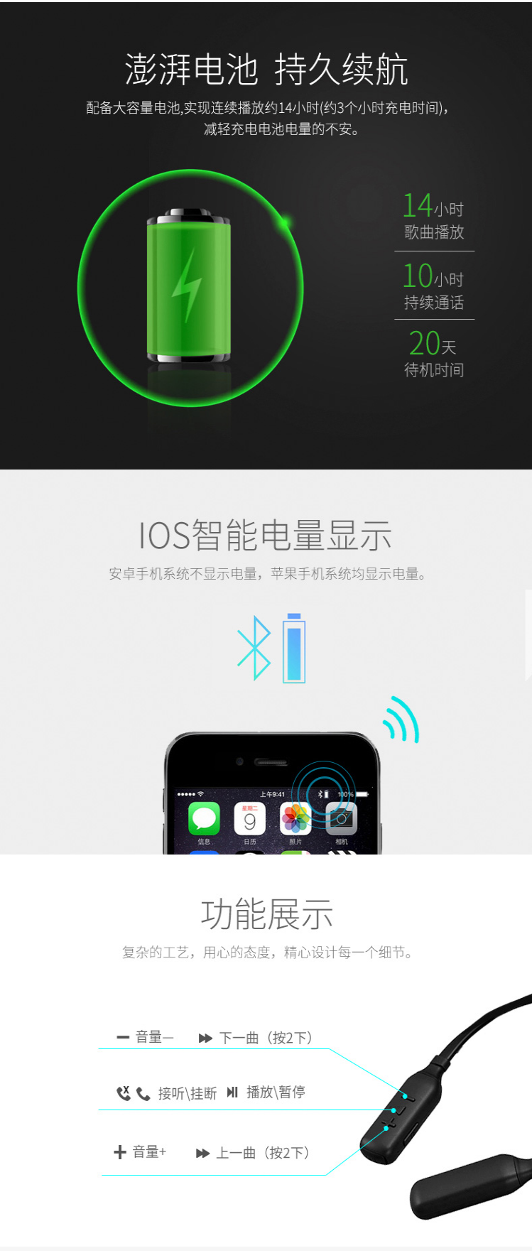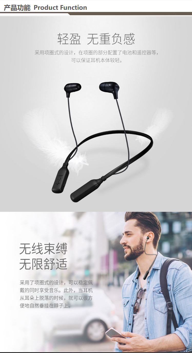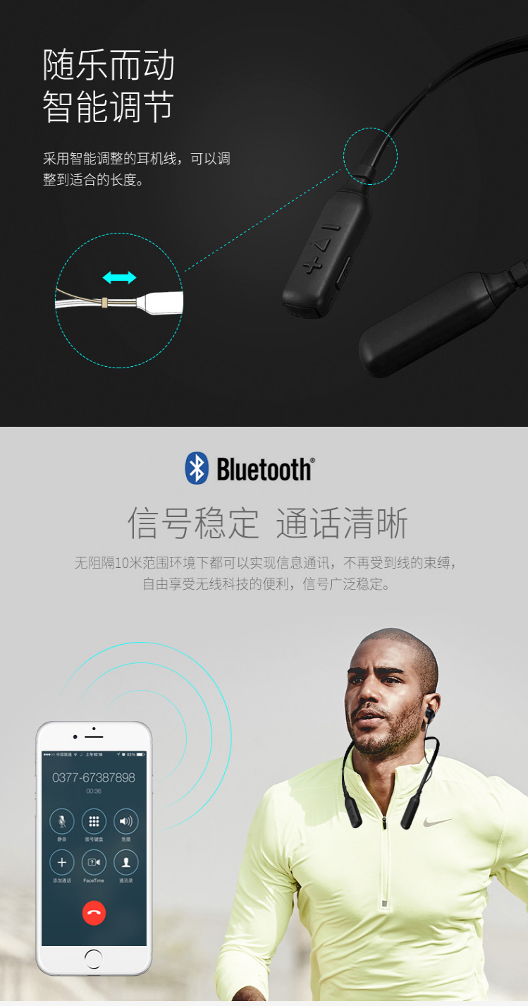 蓝牙耳机收纳便捷,携带方便,棉花糖式入耳式耳套 增强低音,不漏音,且通透 想怎么收纳就怎么收 千机变 盲触操作耳机线轻量化