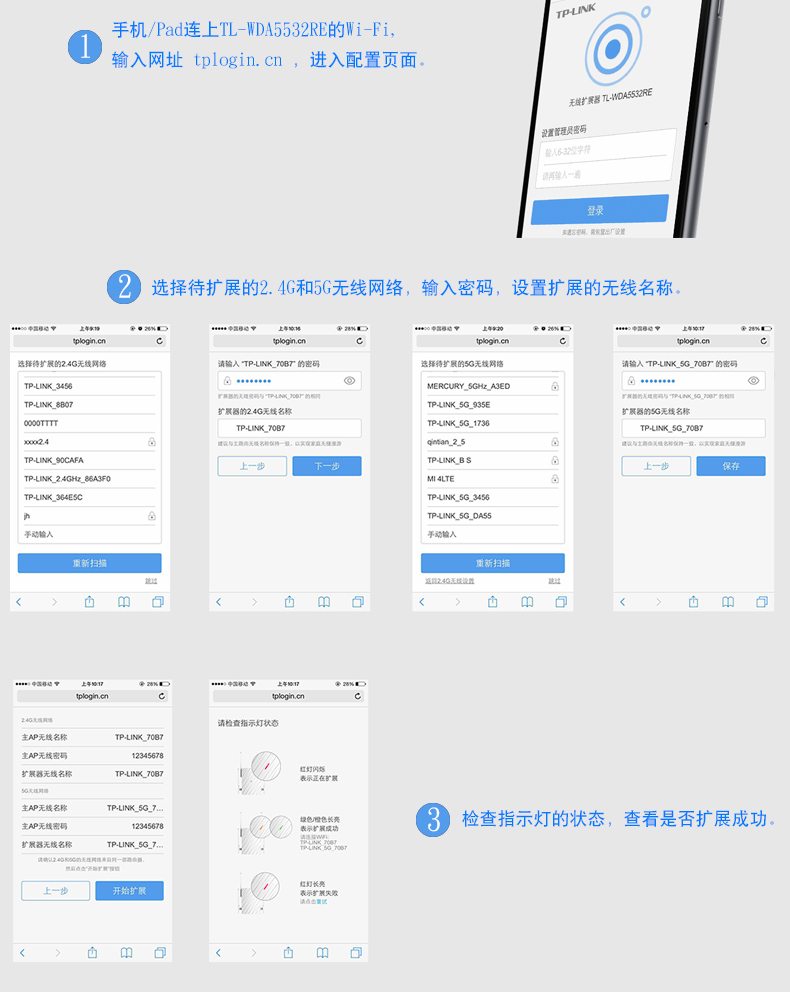 tp-link扩展器配对共分为四步,只需要登录后输入扩展wifi名称和密码即可开始扩展。具体操作步骤如下:
