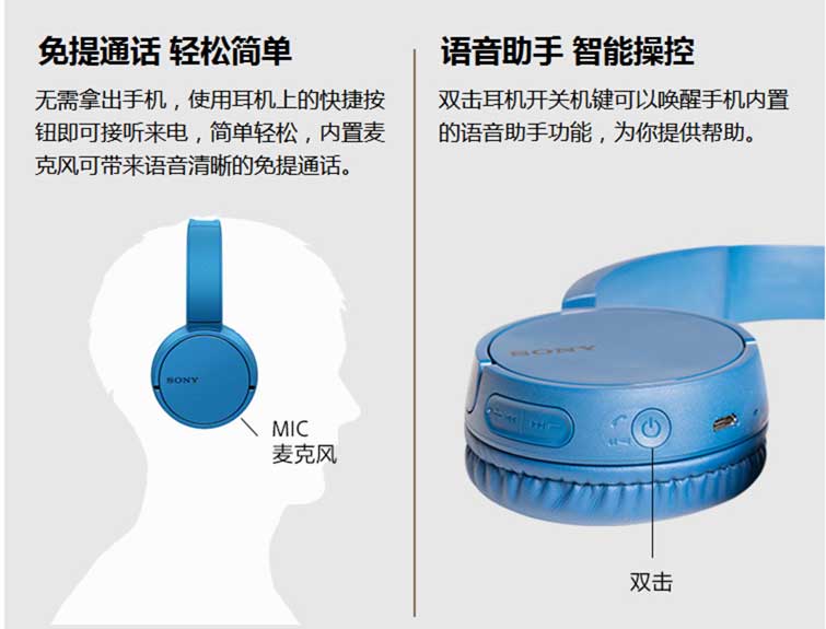索尼WH-CH500耳机支持无线蓝牙连接手机使用,可以在手机上收听音乐,同时耳机也能收听到手机的来电,当有来电时,可以在...