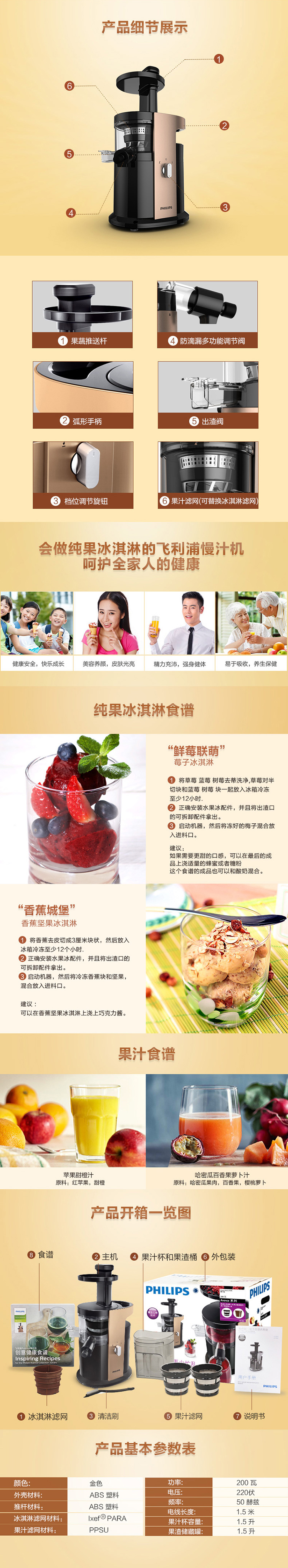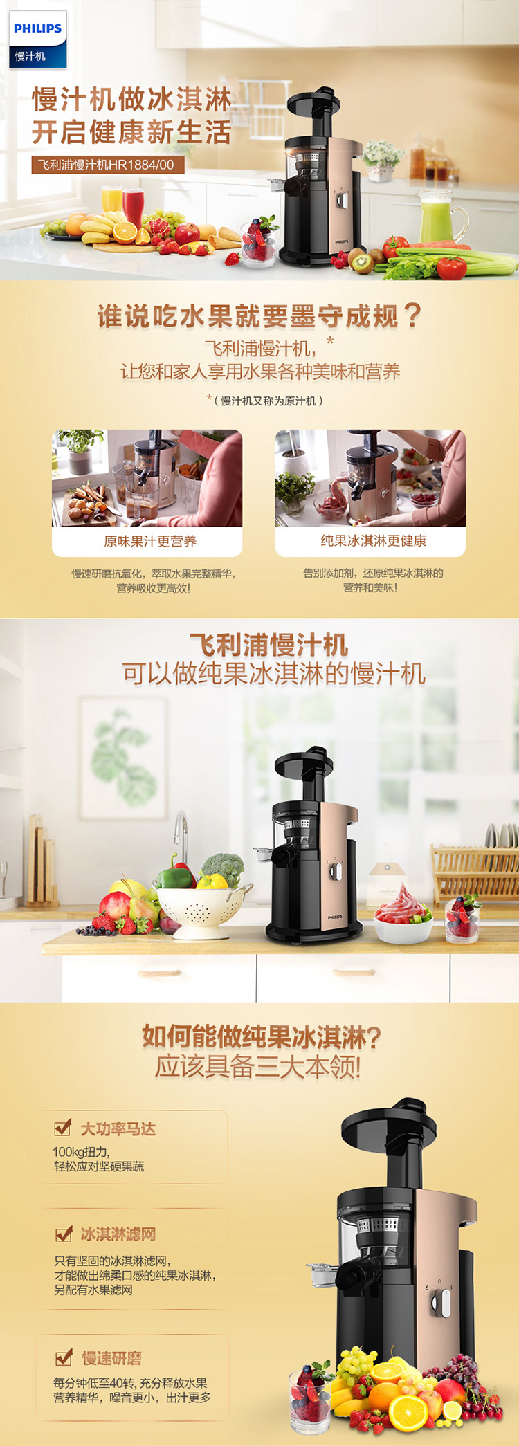 飞利浦(PHILIPS)原汁机 家用低速型可做果汁可榨汁可做纯果冰激凌 HR1884/00