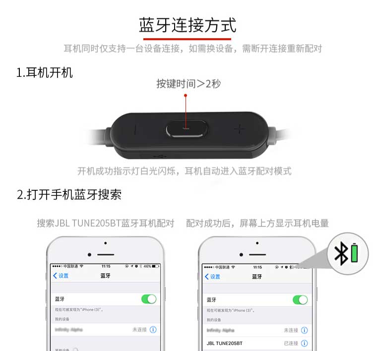 耳机通过蓝牙连到手机上之后,只要在手机上播放音乐即可在耳机上聆听,享受无线音乐的乐趣,耳机上设计有三键线控模块,可以直接...