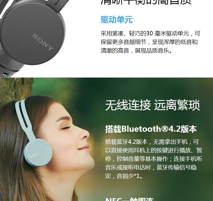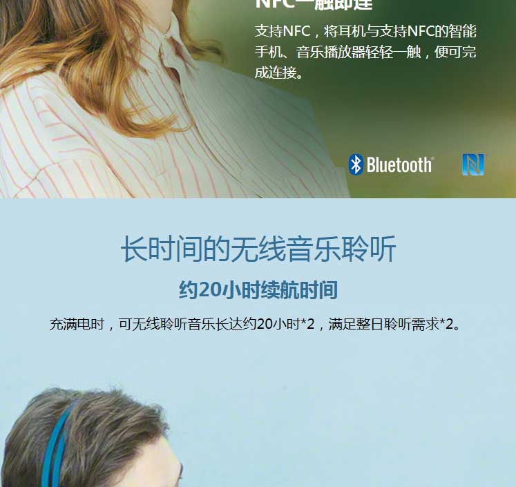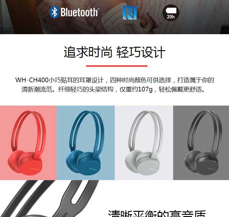 耳机仅重约107g,却具有约20小时长续航。轻巧贴耳,配色清新,蓝牙4.2/NFC触连。
