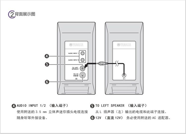 1、将电缆从扬声器背面的 L 扬声器(左)连接到 R 扬声器(右)的输入端子 TO LEFT SPEAKER。2、使用附...