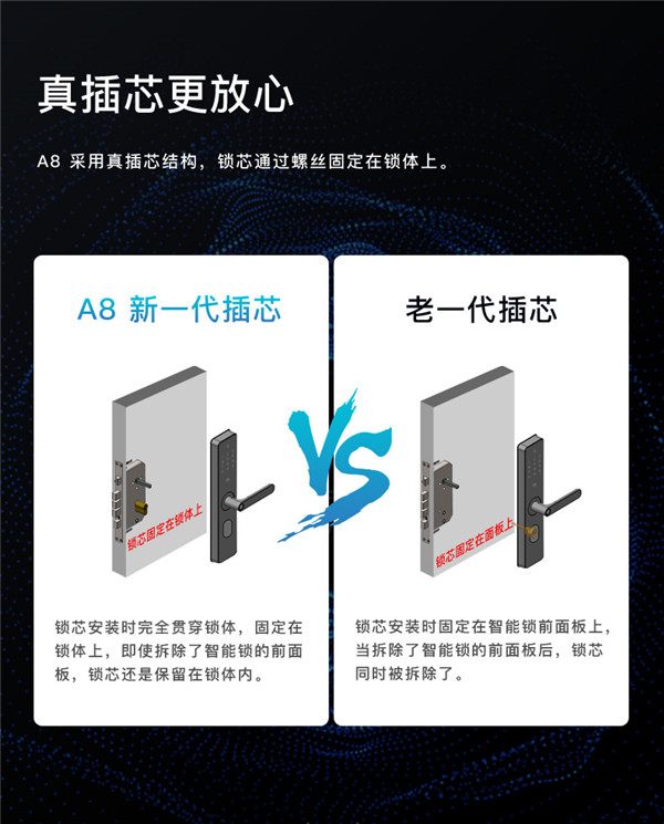 汇泰龙A8指纹锁是一款“C级锁芯+真插芯”的指纹锁产品,安全性能非常高,而且价格也压在2000元以下。除了这几点之外它还...