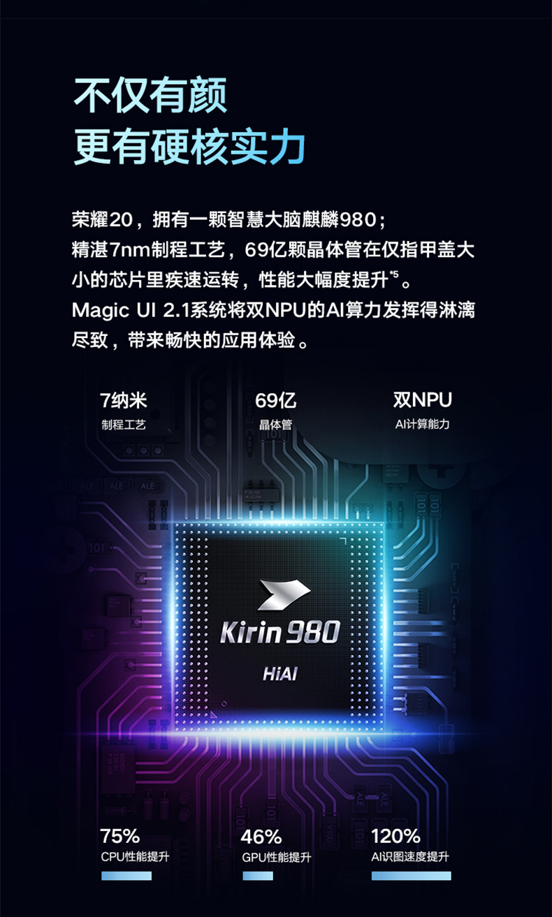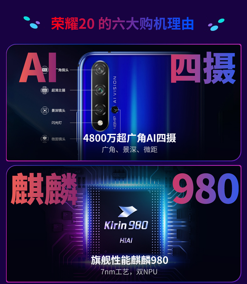 这是两款完全不同价位的手机,荣耀20i搭载麒麟710处理器,而荣耀20搭载麒麟980,荣耀20i手机后置3摄像头,240...