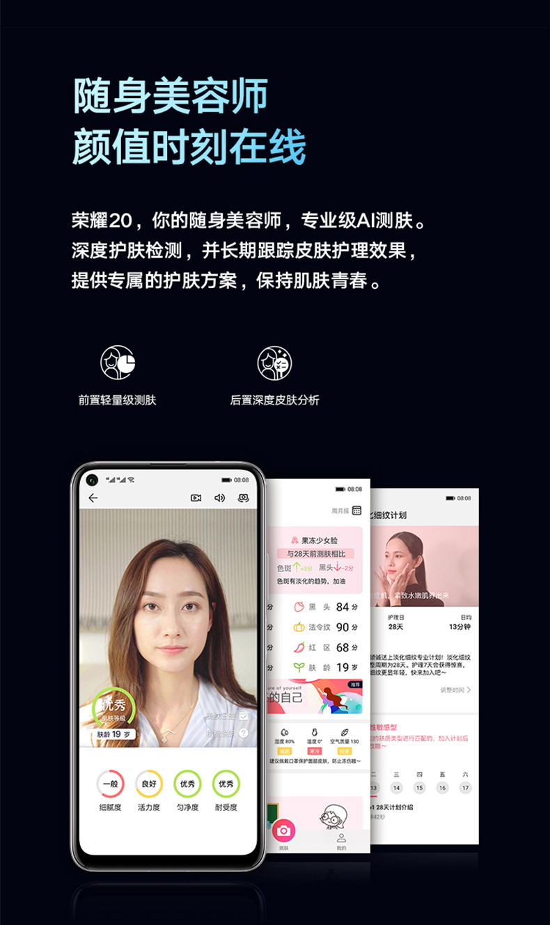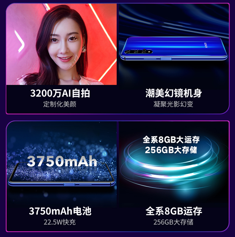 荣耀20采用6.26英寸屏,前置3200万单摄,后置四摄,搭载麒麟980芯片,电池3750mAh,支持22.5W充电。而...