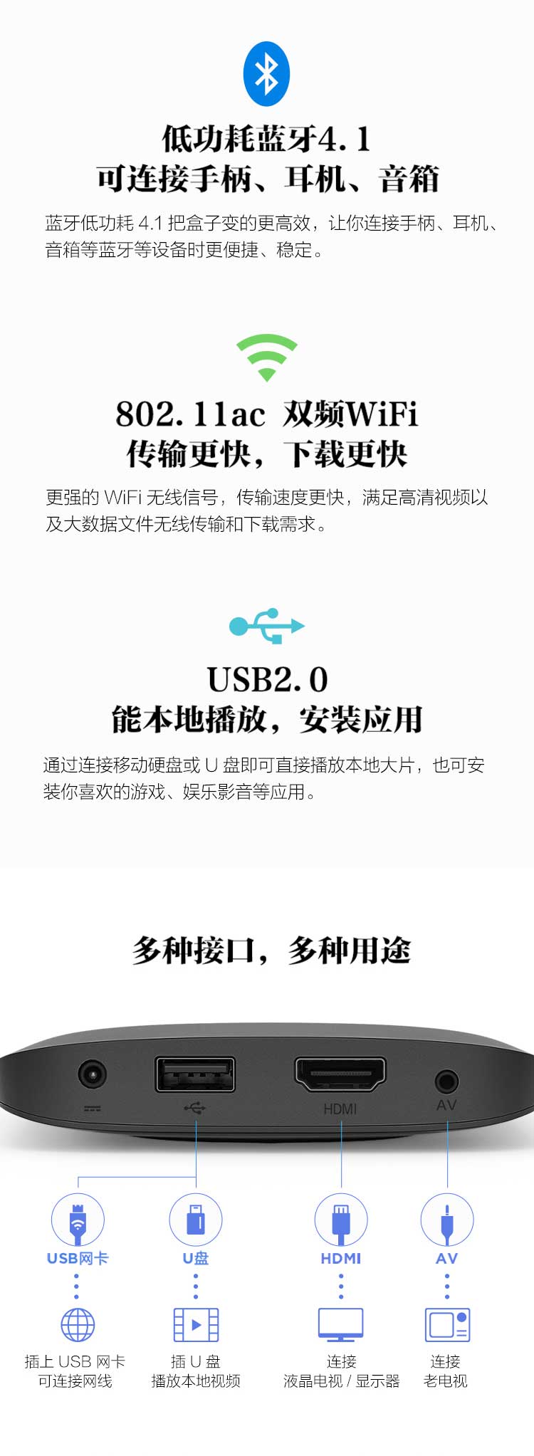 主流配置,安卓5.0全新系统,快感十足!4K输出,WIFI蓝牙,为老电视保留AV输出,支持USB本地播放,高性价比好盒子!